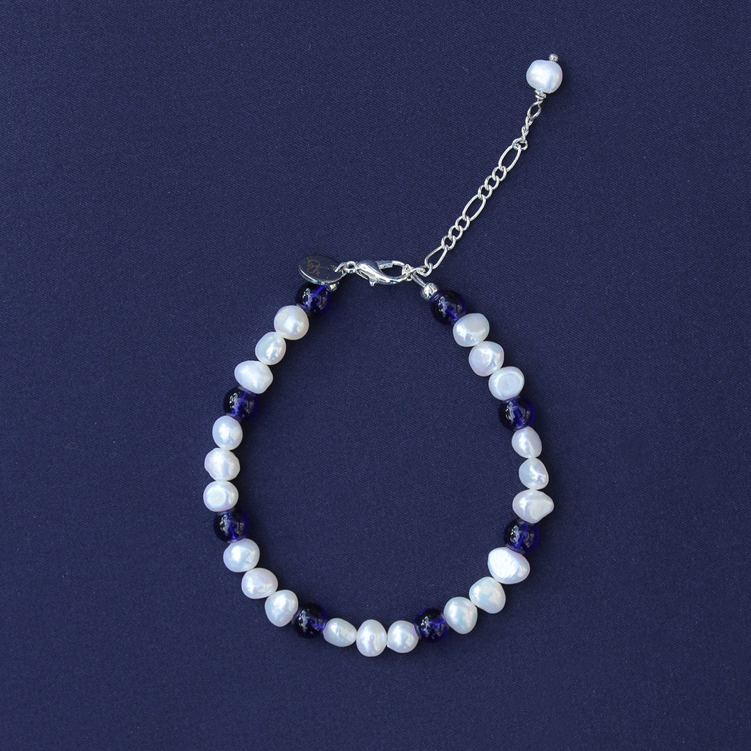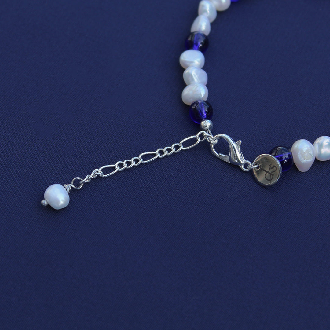 The Drip or Drown bracelet is composed of Freshwater Pearls and blue Glass Beads accompanied by Silver Plated metal.