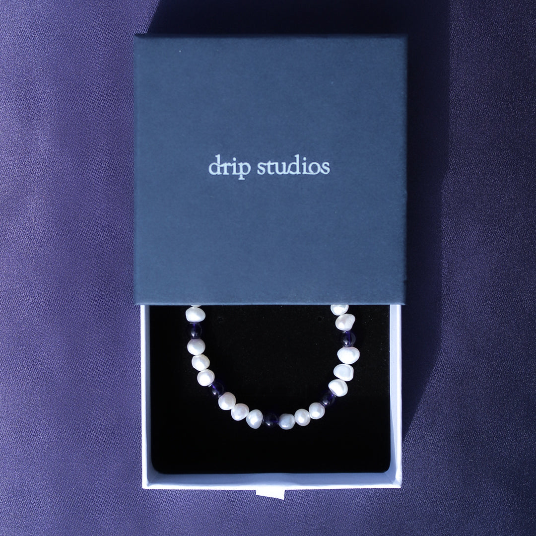 Our staple bracelet features a Drip Studios tag at the clasp end. It is made up of twenty-two white pearls with waves of eight deep blue glass beads.