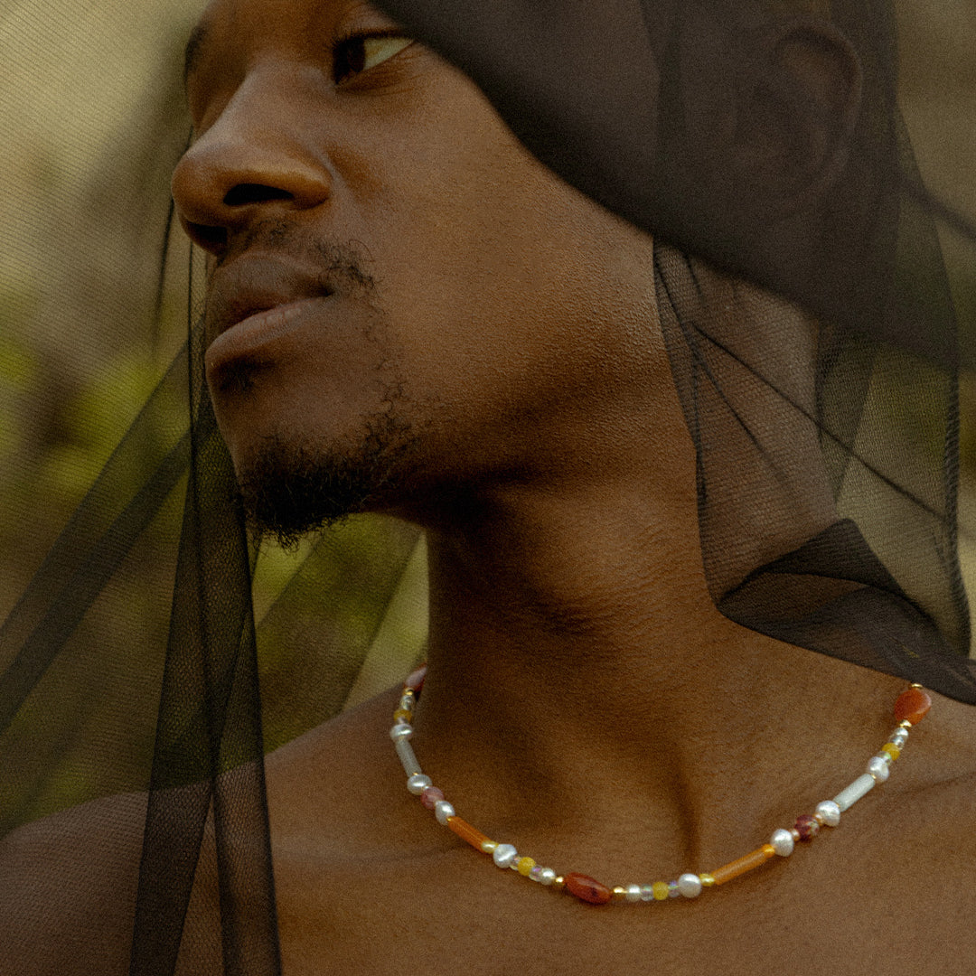 gold plated necklace featuring carnelian precious stones, yellow jade, freshwater pearls, and millefiori glass beads.