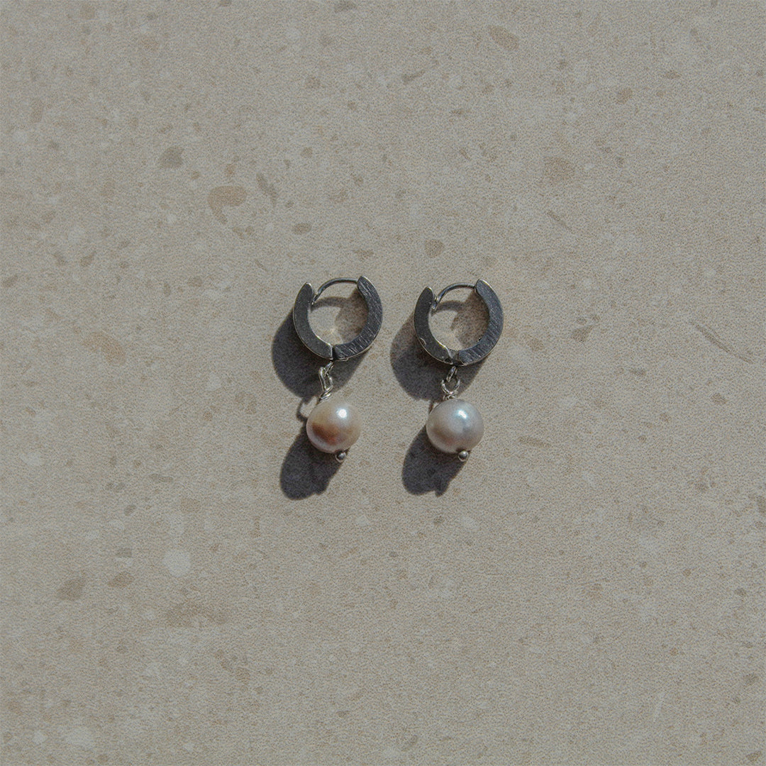 silver plated earrings featuring large silver freshwater pearls on chunky huggers.