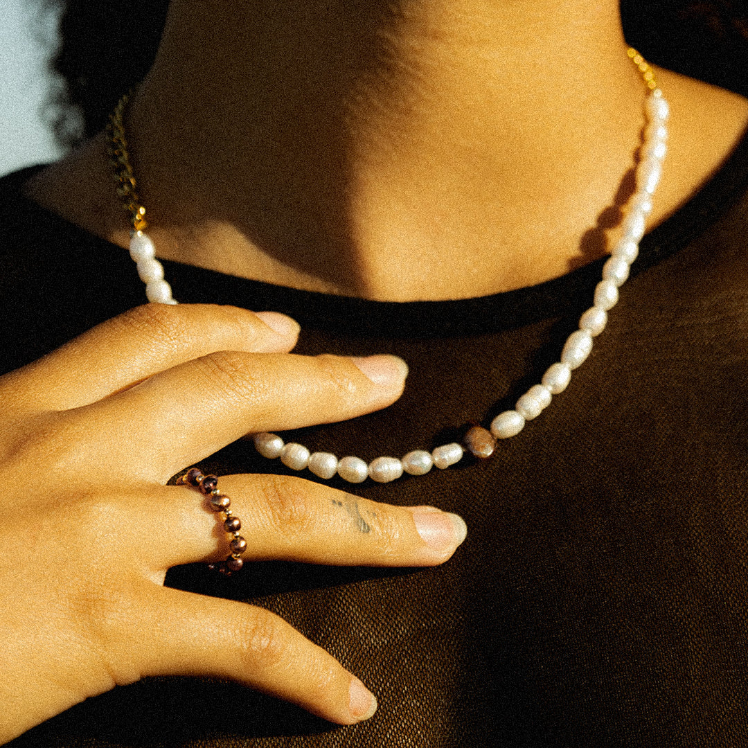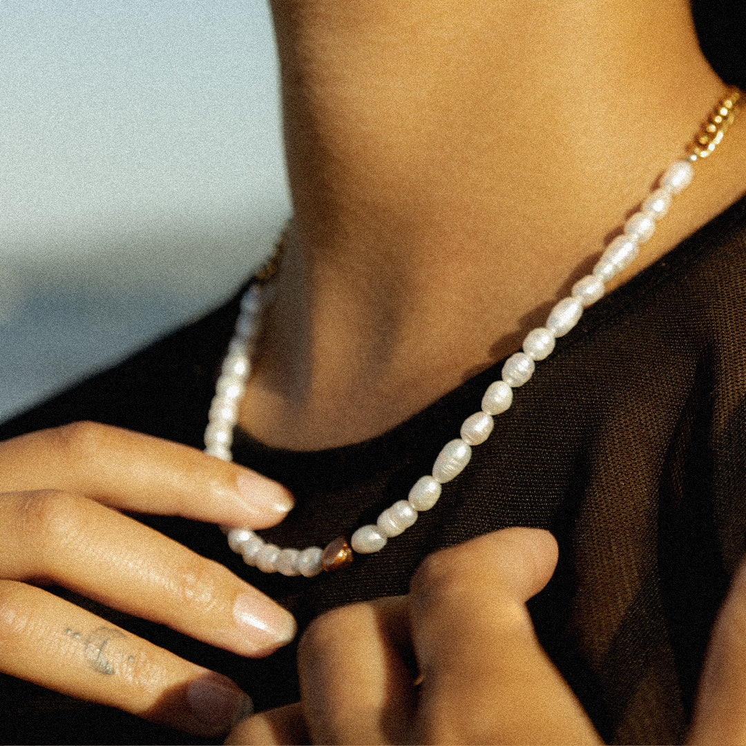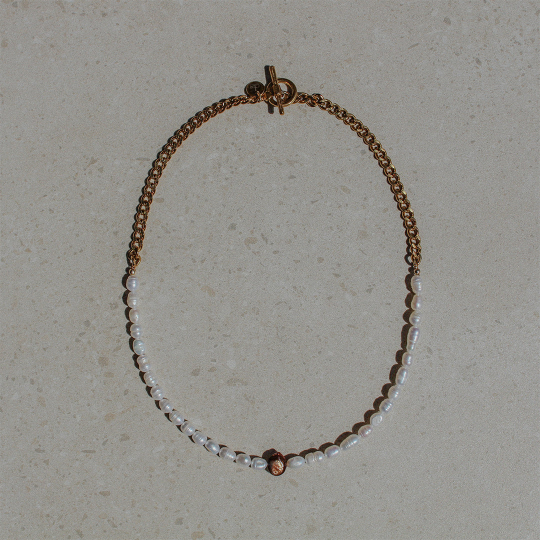 gold plated necklace featuring a large brown baroque freshwater pearl, white rice shape freshwater pearls, gold cuban chain, and t-clasp.