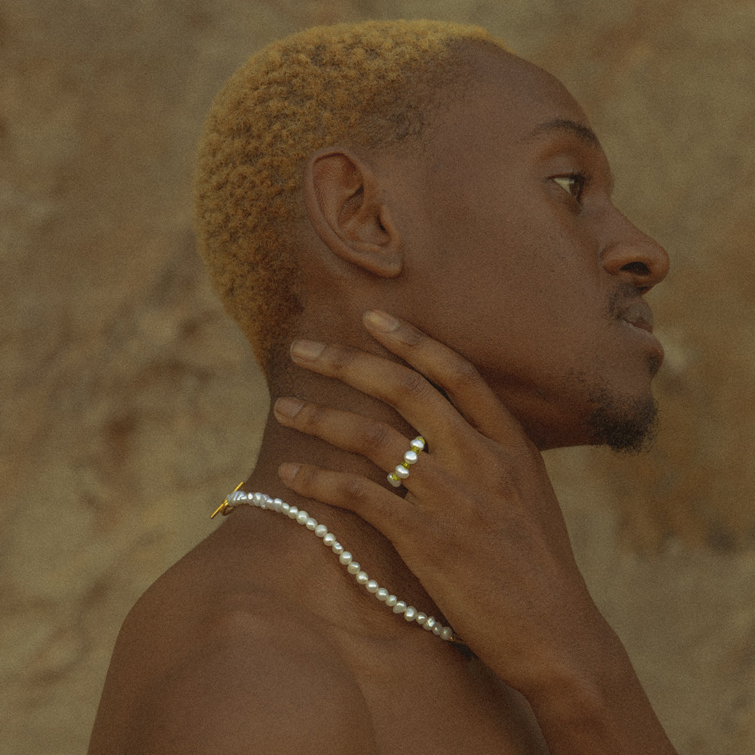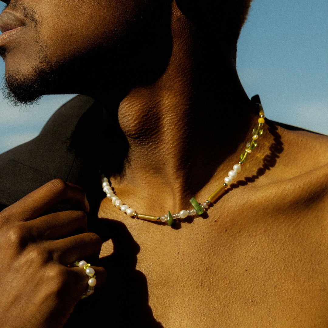 gold plated necklace featuring precious pounamu stone, yellow jade, freshwater pearls, millefiori, glass beads, with a t-clasp.