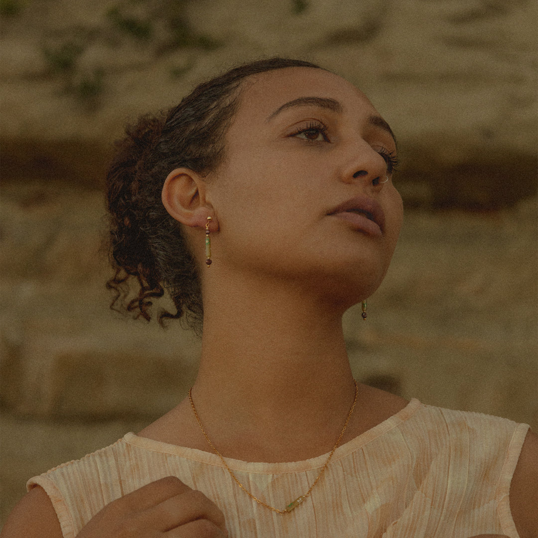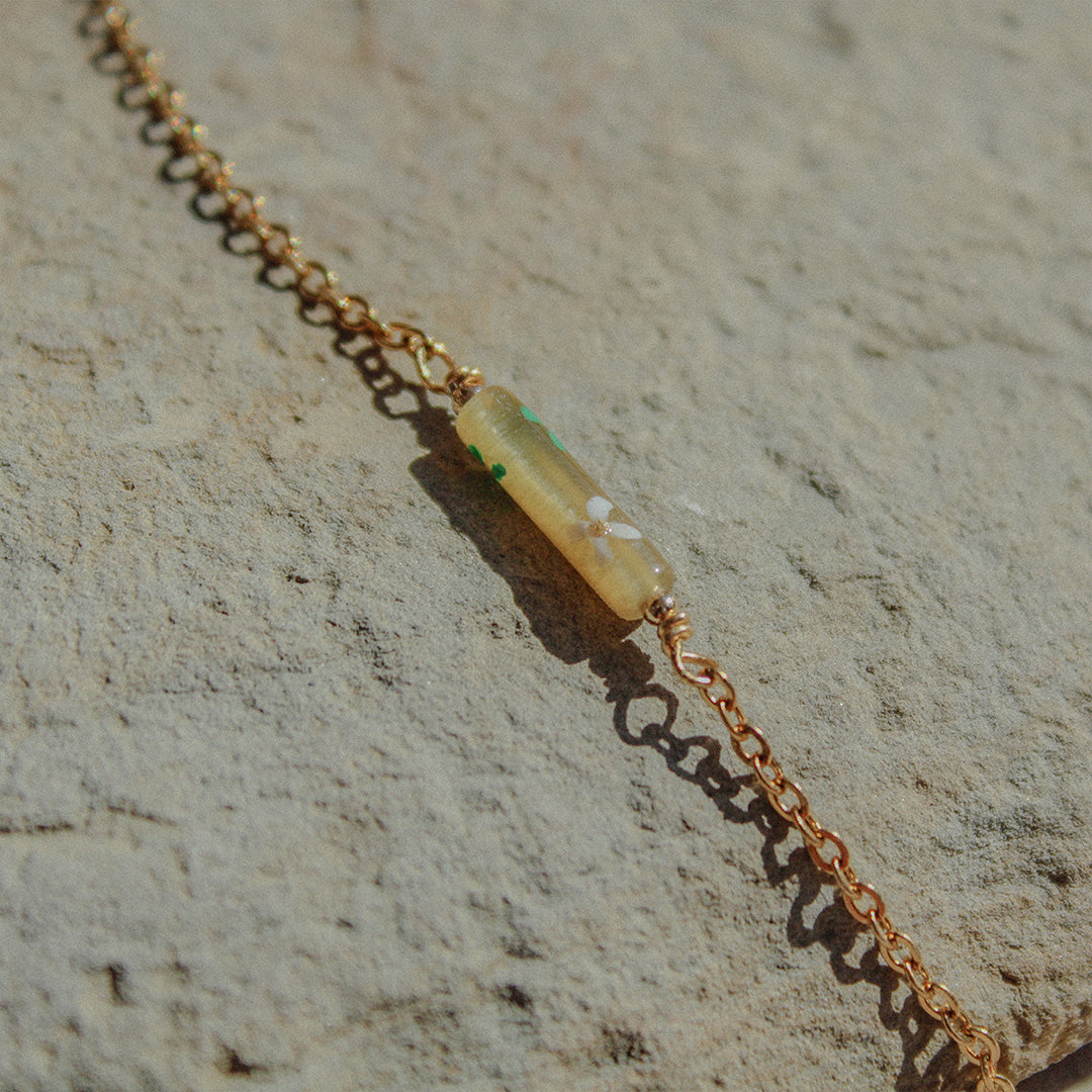 gold plated necklace featuring our first hand-painted glass beads with green and white flowers, and freshwater pearls at the clasp.