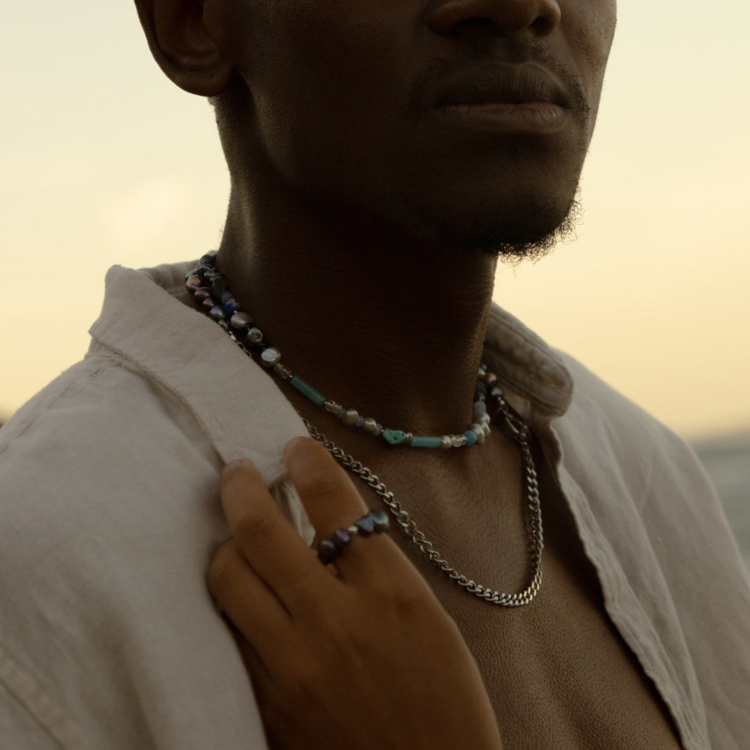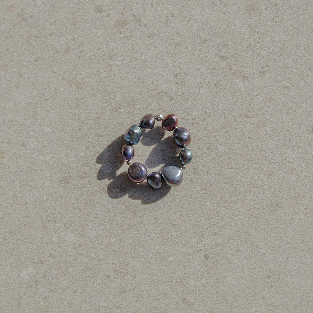 silver plated ring featuring dark blue freshwater pearls and silver beads.