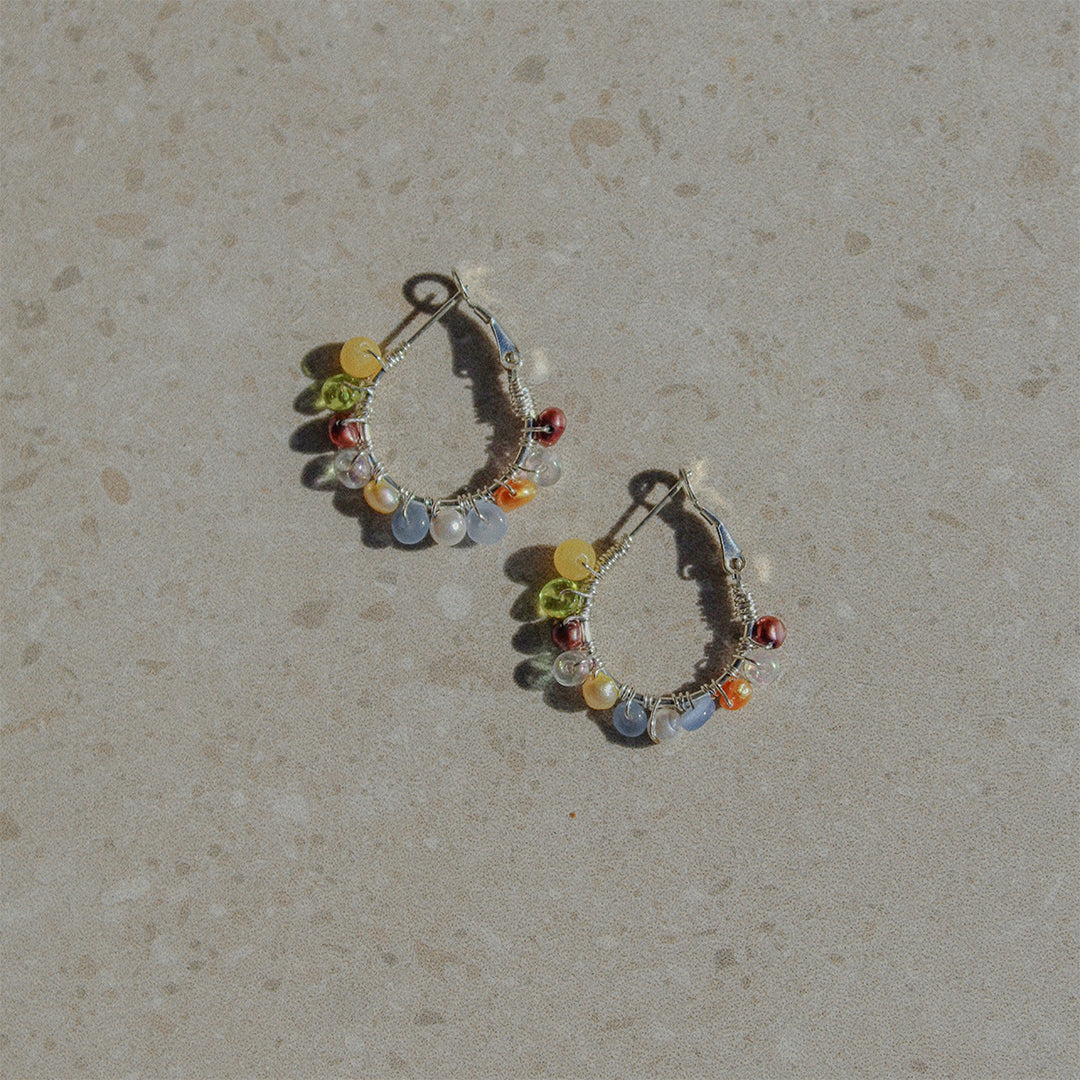 sterling silver earrings featuring yellow jade, miniature freshwater pearls, and glass beads on a mini hoop.
